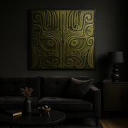 Ett kraftfullt och mystiskt konstverk med ett motiv inspirerat av mytologiska drakar. Den stiliserade designen med intrikata linjer och symmetriska former skapar en känsla av styrka och mystik, medan den metalliska tonen ger tavlan ett exklusivt och tidlöst uttryck.