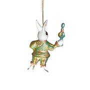 Förvandla ditt påskris till en festlig maskerad med detta eleganta hänge föreställande en vit kanin i full galastass. Kaninen bär en sofistikerad guldskimrande dräkt med silvriga spetsdetaljer, en dekorativ mask för ögonen & håller stolt i en gyllene spira. Med en höjd på 12 cm & en bredd på 7 cm blir detta hänge ett ståtligt & iögonfallande inslag i din påskdekoration. Den detaljrika designen & de lyxiga färgvalen ger en unik karaktär som kombinerar traditionellt påskfirande med en touch av magi & flärd.